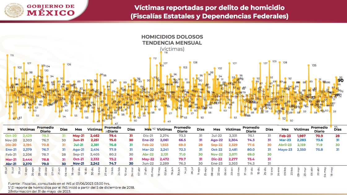Según las cifras oficiales del Gobierno de México, en mayo se registraron 75.8 asesinatos por día, más que enero, la referencia más alta que se tenía, de 74.3.