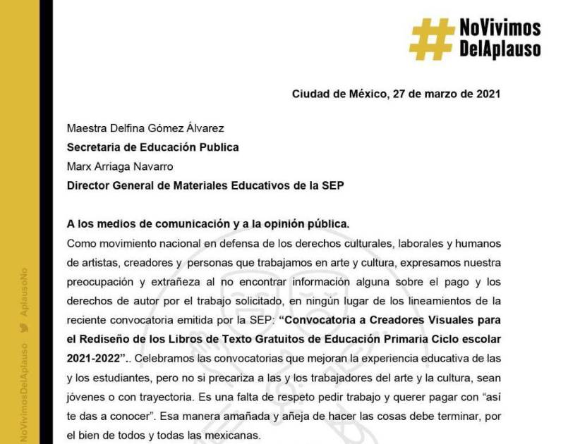 De ahí que el “Movimiento No vivimos del Aplauso”, integrado por la comunidad de artistas y creadores, emitieron una carta dirigida a la secretaria de Educación, Delfina Gómez, y al director general de Materiales Educativos, Max Arriaga, para expresar su descontento por dicha convocatoria.