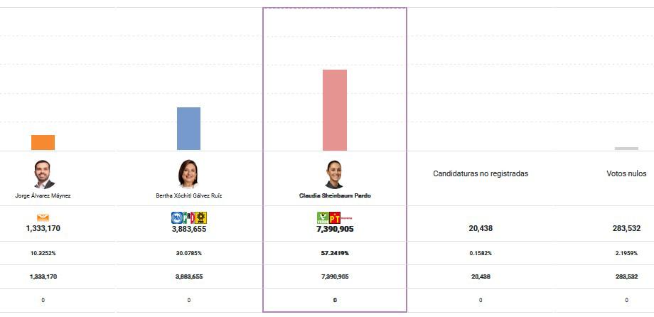La candidata a la Presidencia de México por la coalición Sigamos Haciendo Historia sumaba cuatro horas después del cierre de las casillas un 57.24 por ciento de la votación, según lo publicado por el INE.