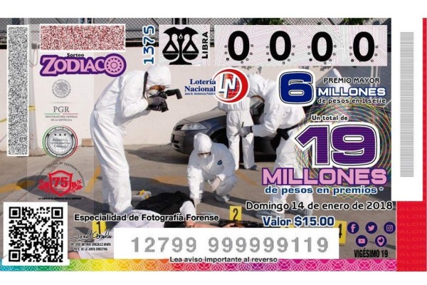 La Lotería Nacional incluyó la imagen de una escena del crimen en uno de los billetes del Sorteo Zodiaco, para reconocer la labor de los peritos de la Procuraduría General de la República (PGR), quienes acuden a recabar evidencia cuando ocurre un delito.