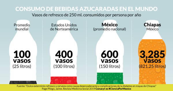 En promedio, cada persona de la entidad bebe 821.25 litros por año, reporta un estudio del Centro de Investigaciones Multidisciplinarias sobre Chiapas y la Frontera Sur (CIMSUR). Esta situación se relaciona con la alta prevalencia de diabetes mellitus en la región, que en la última década ha sido la principal causa de muerte.