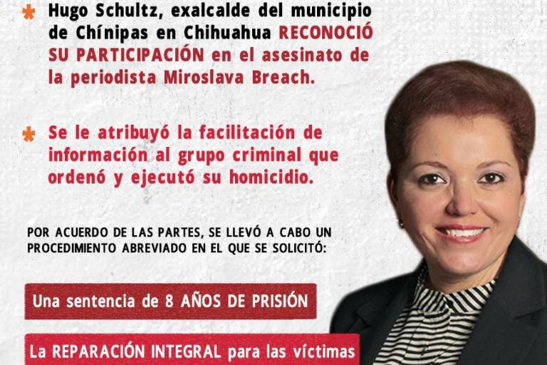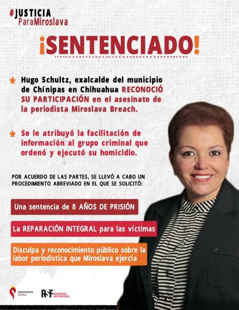 Hugo Ahmed Schultz Alcáraz fue sentenciado a 8 años de prisión por una juez federal, este martes 15 de junio, como participe auxiliador en el homicidio de la periodista Miroslava Breach Velducea, además de que se le ordenó la reparación integral del daño, consistente en la compensación económica y una disculpa pública de viva voz del ex alcalde de Chínipas, Chihuahua.