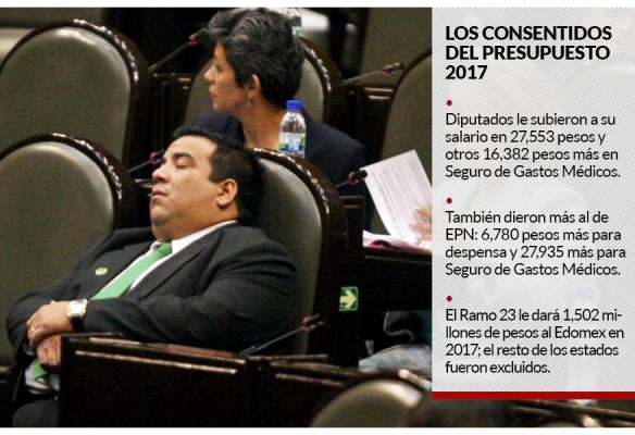A los diputados no les gustó la remuneración que la Secretaría de Hacienda y Crédito Público propuso para ellos en el paquete 2017. Así, sus sueldos tendrán un aumento de 27 mil 553 pesos. Con esto, los legisladores pasarán de una percepción salarial de 1 millón 432 mil 997 pesos a 1 millón 460 mil 550 pesos.