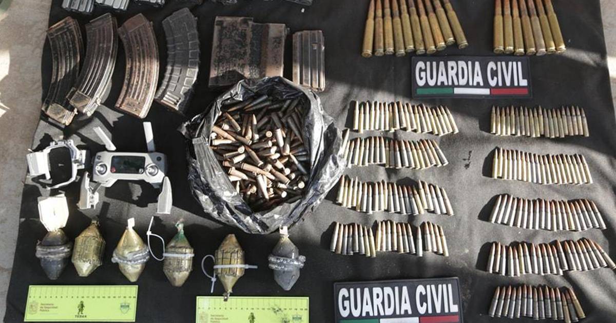Como parte de estas acciones, las fuerzas de seguridad decomisaron seis explosivos para drones, cartuchos de varios calibres, equipo táctico, precursores químicos, un control de dron y una camioneta robada.