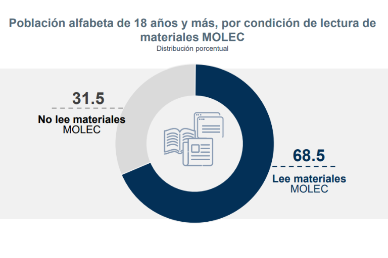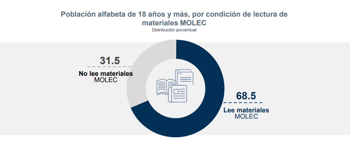 También se informa que por tipo de material de lectura, los libros tuvieron la mención más alta entre la población lectora: el 40.8 por ciento señaló haber leído, al menos, un libro en los últimos 12 meses; el 37.7 por ciento mencionó la lectura de páginas de Internet, foros o blogs; 23.6 por ciento dijo que leyó revistas; 18.5 por ciento, periódicos y 6.1 por ciento, historietas. Entre 2016 y 2023, disminuyó la población lectora de periódicos y revistas de 28.1 y 17.9 puntos porcentuales, respectivamente.