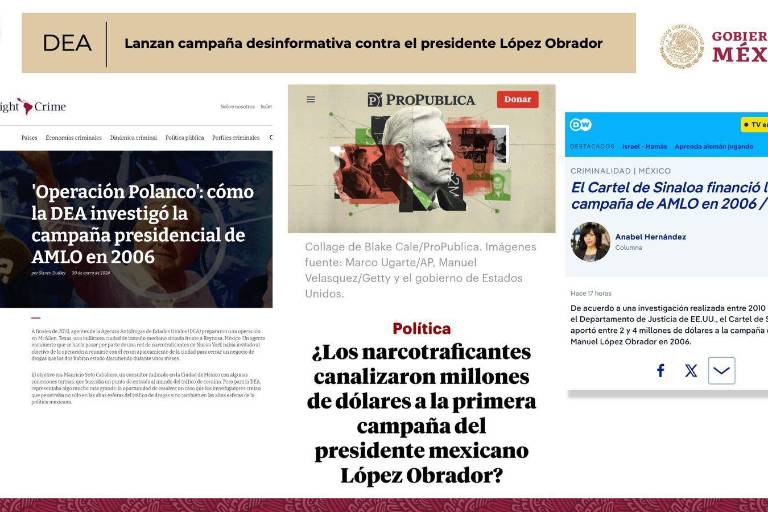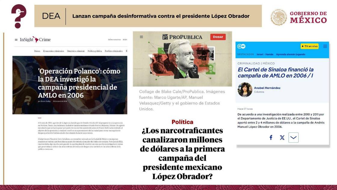 El Presidente Andrés Manuel López Obrador desmintió que en 2006 haya recibido dinero del Cártel de Sinaloa para su campaña presidencial, según lo indicaron los medios estadounidenses Propublica -agencia de noticias independiente- e InSight Crime -fundación dedicada al estudio y a la investigación de amenazas para la seguridad nacional y la ciudadana en América Latina y el Caribe-, así como una columna opinión escrita por la periodista mexicana Anabel Hernández García y publicada en el medio alemán Deutsche Welle.