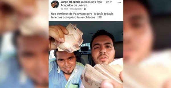 "Nos corrieron de [el cantabar] Palomazo, pero todavía todavía tenemos con queso las enchiladas!!!!!!", dice la publicación en la cuenta de la red social Instagram de Jorge Hernández Laredo, en donde ambos se retrataron con muchos billetes de 500 pesos.
