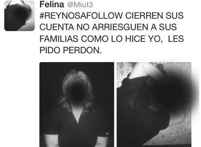 "#REYNOSAFOLLOW CIERREN SUS CUENTAS NO ARRIESGUEN A SUS FAMILIAS COMO LO HICE YO, LES PIDO PERDON". Estos tuits fueron acompañados de dos imágenes, una donde Felina aparece amordazada y otra que sugiere su asesinato.