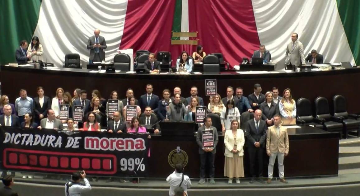 Algunos diputados federales de la oposición subieron a la tribuna del Salón de Plenos de San Lázaro para mostrar pancartas en las que expusieron las implicaciones negativas que, según ellos, podría traer consigo la eliminación de los siete órganos constitucionales autónomos.
