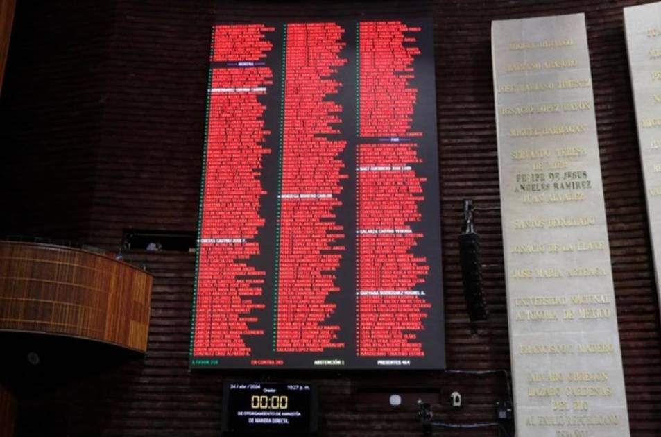 Con 258 votos a favor de legisladores de Morena, Verde y PT, 205 en contra del PRI, PAN, PRD y Movimiento Ciudadano, y una abstención, el Pleno de la Cámara de Diputados aprobó en lo general, una iniciativa de reforma que adiciona un artículo 9 a la Ley de Amnistía.