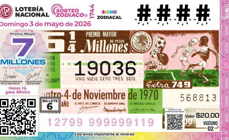 El Sorteo Zodiaco No. 1744 se realizará el domingo 3 de mayo de 2026, a las 20:00 horas; reparte un Premio Mayor de 7 millones de pesos en una serie y tiene una bolsa de 24 millones de pesos en premios, su transmisión será en vivo por el canal de YouTube institucional Sorteos Tradicionales de la Lotería Nacional. Los cachitos 5 y 6 ya se encuentran disponibles en los puntos de venta de Lotería Nacional, en milotería.mx y en la App MiLotería.