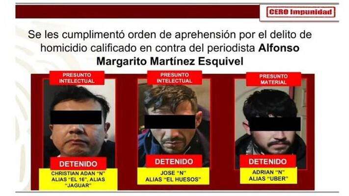 Ricardo Mejía Berdeja, subsecretario de la Secretaría de Seguridad y Protección Ciudadana del Gobierno federal, informó que se ejecutaron tres ordenes de aprehensión por el delito de homicidio calificado en contra del fotoperiodista Alfonso Margarito Martínez Esquivel, asesinado en Tijuana, Baja California.