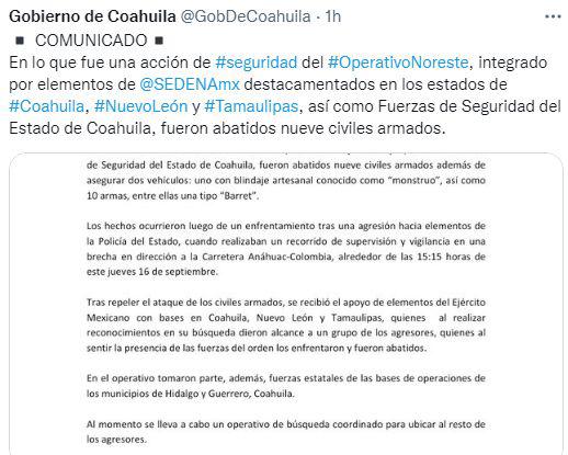 “Tras repeler el ataque de los civiles armados, se recibió el apoyo de elementos del Ejército Mexicano con bases en Coahuila, Nuevo León y Tamaulipas, quienes al realizar reconocimientos en su búsqueda dieron alcance a un grupo de los agresores, que al sentir la presencia de las fuerzas del orden, los enfrentaron y fueron abatidos”, agregó el Gobierno estatal.