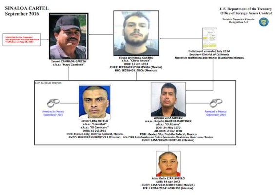 Mediante un comunicado, la Embajada de Estados Unidos dio a conocer que Eliseo Imperial Castro, “Cheyo Antrax” y sobrino de “El Mayo”, Alfonso Lira Sotelo, “El Atlante”, Javier Lira Sotelo, “El Hannibal” o “El Carnicero”, y Alma Delia Lira Sotelo fueron designados en tal padrón, por sus actividades relacionadas con “el narcotráfico y lavado de dinero en apoyo al Cártel de Sinaloa”.