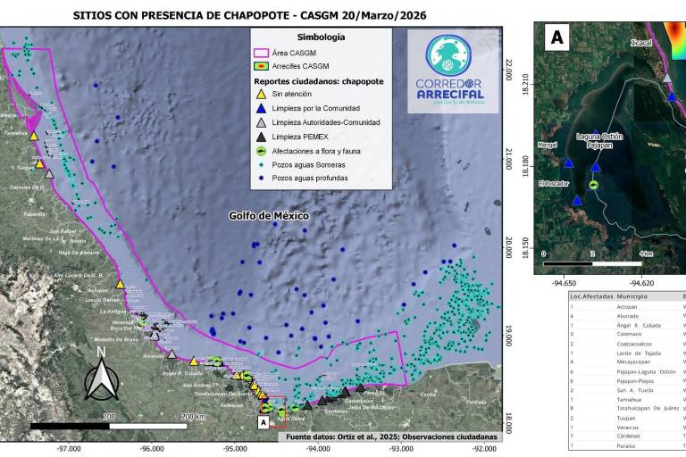 Sin embargo, en los registros de la Red del Corredor Arrecifal junto con las comunidades, se puede observar que hay un total de 26 sitios que no han recibido ninguna atención: en nueve sitios se ha realizado limpieza únicamente por las comunidades; en ocho sitios la limpieza la han realizado autoridades junto con comunidades, y en ocho sitios la limpieza ha sido realizada por parte de Pemex.