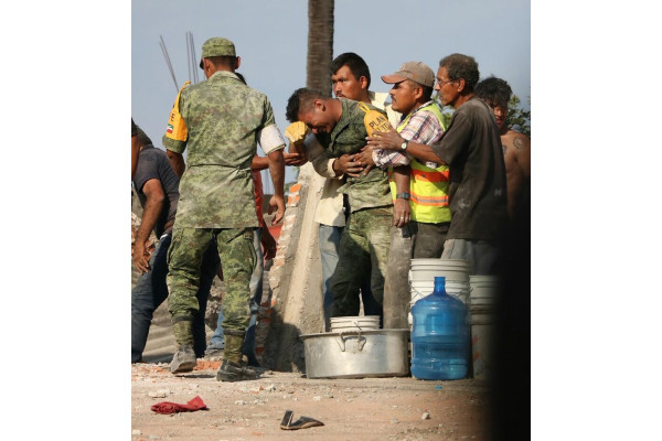 La fotografía que se ha vuelto viral muestra detrás del soldado a un grupo de rescatistas improvisado, uniformados con chalecos fluorescentes llenos de tierra, otros más ni siquiera llevan chaleco, son los vecinos que han venido a ayudar.