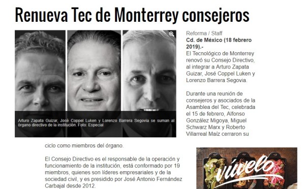 El Instituto Tecnológico y de Estudios Superiores de Monterrey (ITESM) renovó su Consejo Directivo, el 15 de febrero, al integrar al empresario sinaloense José Germán Coppel Luken, además de a Arturo Zapata Guízar y a Lorenzo Barrera Segovia.
