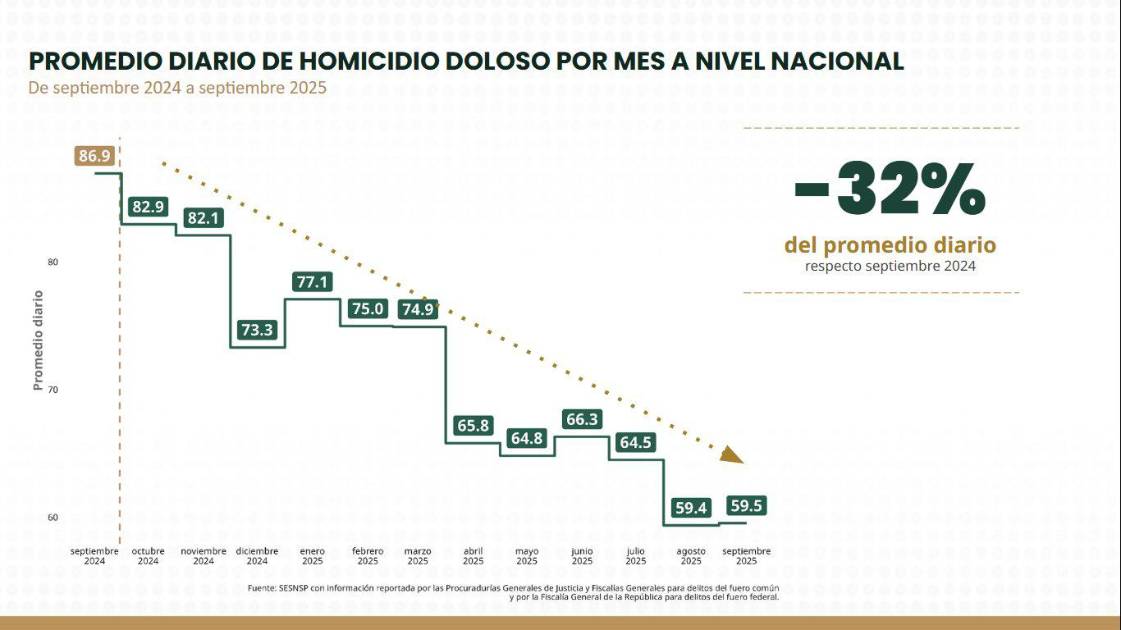 “La administración de la Presidenta, la doctora Claudia Sheinbaum [Pardo], inició con un promedio de 86.9 homicidios diarios en el País y este septiembre de 2025 cerró en el 59.5 está disminución, que como señalaba es de 32 por ciento, este septiembre de 2025, se registraron 27 homicidios dolosos menos diarios de los que se registraron en septiembre de 2024”, detalló la funcionaria federal.