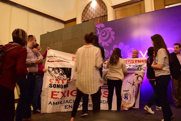 “Que le quede claro a Margarita Zavala que en Sonora no la queremos como candidata y menos como Presidenta”, arengaron los maestros; esto provocó que saliera huyendo del lugar, al cual minutos después regresó para atenderlos.