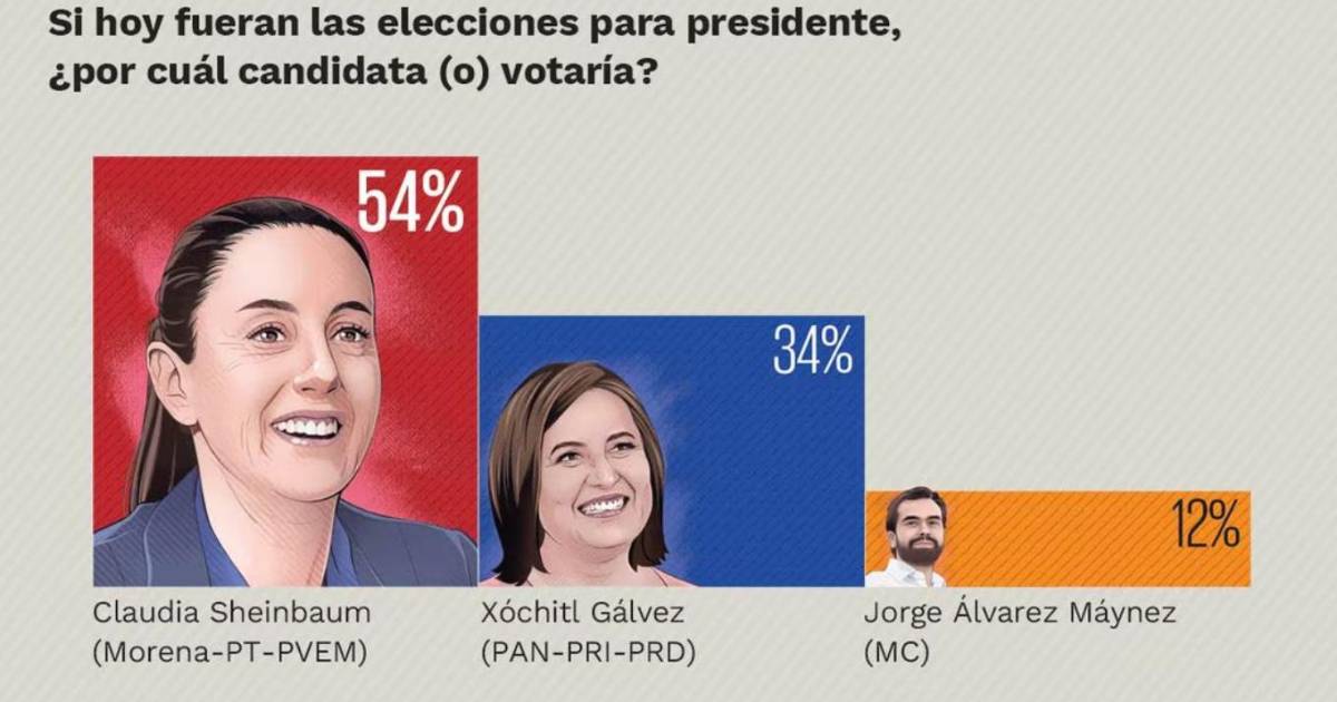 Según el citado ejercicio estadístico, ante la pregunta de “Si hoy fueran las elecciones para presidente, ¿por cuál candidata (o) votaría?”, Sheinbaum tuvo el 54 por ciento de la intención del voto, un incremento de 6 por ciento respecto al último ejercicio estadístico difundido por el mismo rotativo, el 26 de febrero del presente año.