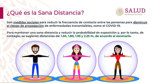 “Para mantener una sana distancia y reducir la probabilidad de exposición y, por lo tanto, de contagio se sugieren distancias de 1.50 metros, 1.80, 1.95 y 2.25 metros, de acuerdo con el escenario”, expuso en Twitter la Secretaría de Salud federal.
