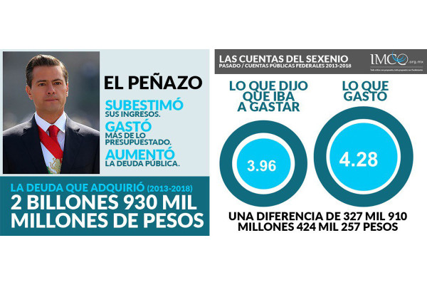 Entre 2013-2018, los ingresos de la administración peñanietista se excedieron en 2 billones 338 mil millones de pesos, por lo que la variación de los ingresos estimados y recaudados fue de 11 por ciento, que de acuerdo con el IMCO es un monto equivalente al “saldo de la deuda conjunta de Pemex y CFE”.