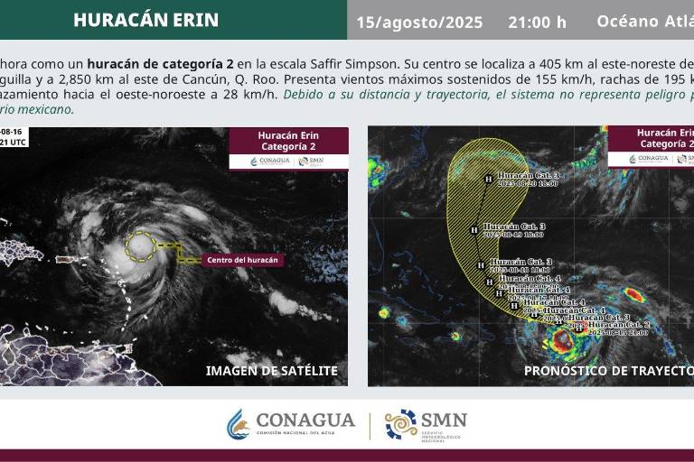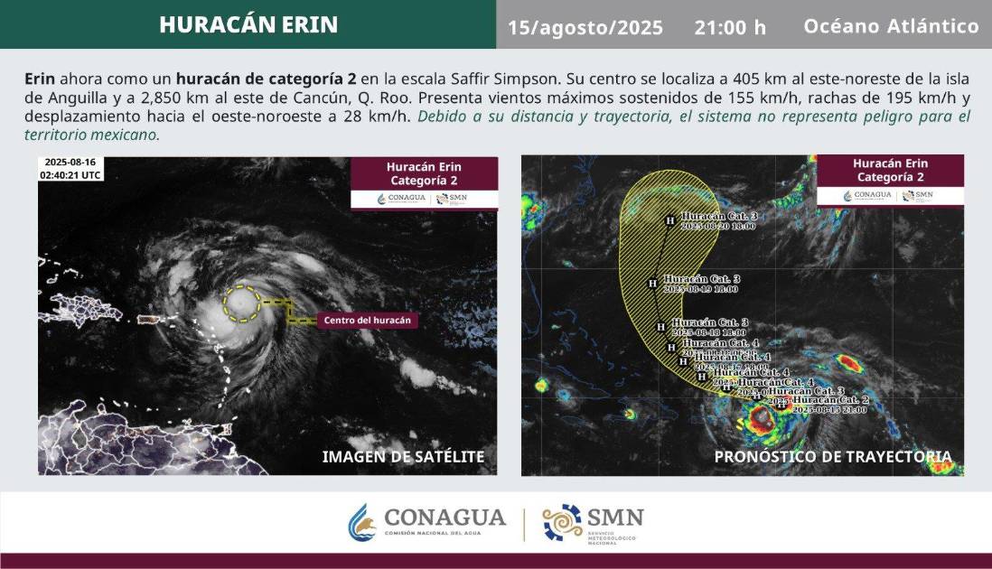De acuerdo con sus condiciones actuales, Erin se ubica a 405 kilómetros al este de la isla de Anguilla y a 2 mil 850 km. al este de Cancún, Quintana Roo. Presenta vientos máximos sostenidos de 155 km/h y rachas de 195 km/h.