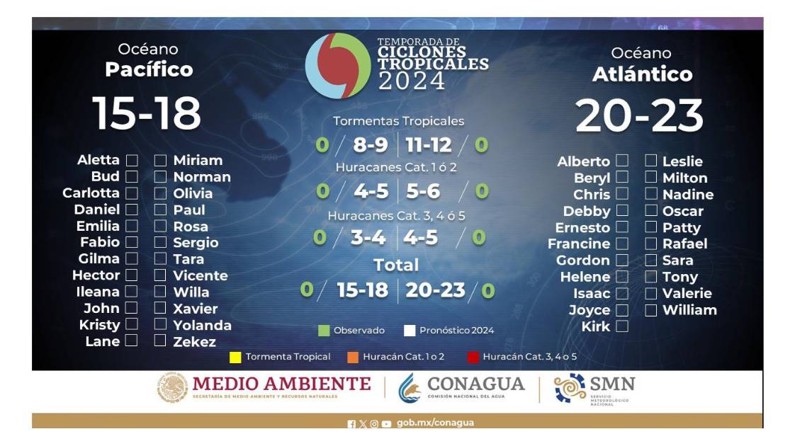 La coordinadora general del SMN, Alejandra Margarita Méndez Girón, informó que para la temporada de ciclones tropicales 2024 en México, se pronostican de 15 a 18 sistemas con nombre en el océano Pacífico, de los cuales entre 8 y 9 serían tormentas tropicales, de 4 a 5 huracanes categorías 1 o 2, y de 3 a 4 huracanes de nivel entre 3 y 5.
