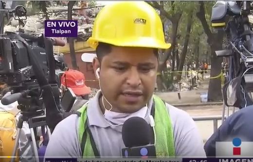 Ciudad de México, 22 de septiembre (SinEmbargo).- Julio Ocaña trabaja como microfonista en la cadena televisiva de Imagen TV. El pasado jueves, en un enlace en vivo, reveló que su esposa, Viridiana García, se encontraba atrapada entre los escombros del multifamiliar ubicado entre Tlalpan y Taxqueña.