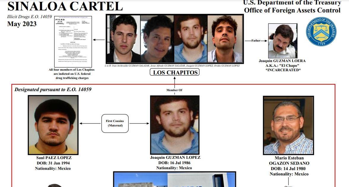 “Las otras tres personas designadas hoy por la OFAC incluyen a Raymundo Pérez Uribe , quien lidera una red de proveedores utilizada por el Cártel de Sinaloa para obtener precursores químicos para la fabricación de drogas ilícitas; Saúl Páez López, quien está involucrado en la coordinación de cargamentos de drogas ilícitas para sus primos hermanos, Ovidio y Joaquín Guzmán López; y Mario Esteban Ogazon Sedano, quien compra precursores químicos ilícitos de Ludim Zamudio Lerma y opera laboratorios de drogas ilegales en nombre del Cártel de Sinaloa”, agregó el Gobierno de EU.