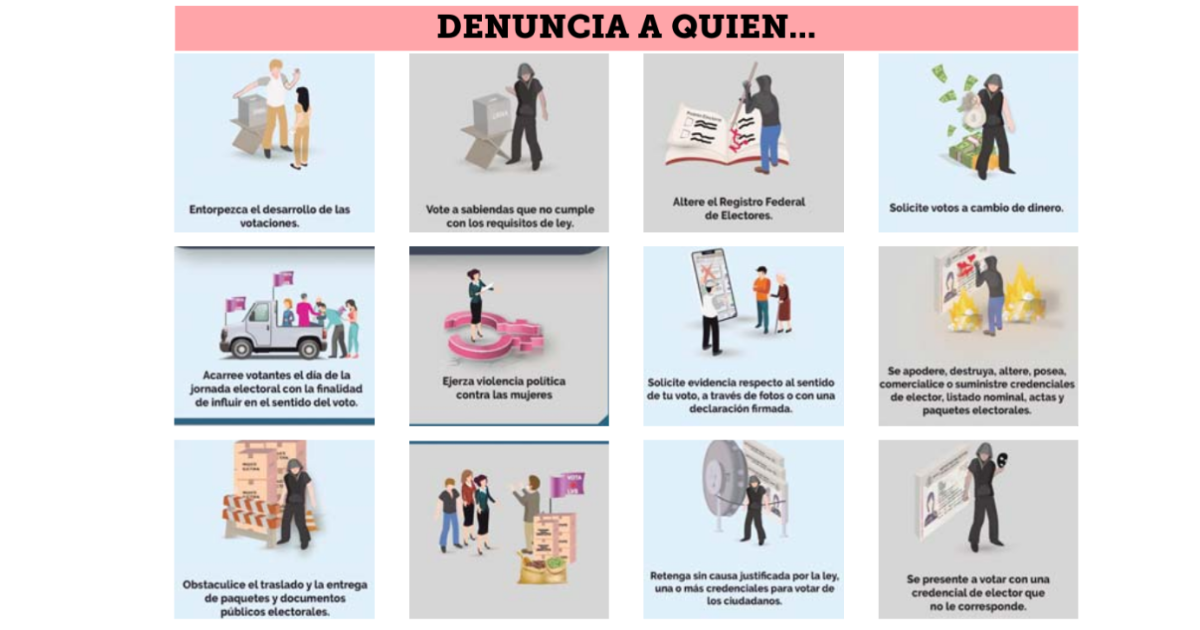 La Fiscalía Especializada en materia de Delitos Electorales (FISEL), de la Fiscalía General de la República (FGR), exhorta a la población a denunciar si observa irregularidades o presiones a la ciudadanía para votar por determinada candidata o candidato o partido político, ya que estos actos son sancionados penalmente por la Ley General en Materia de Delitos Electorales.