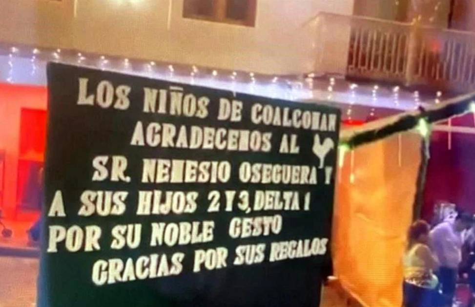 “Los niños de Coalcomán agradecemos al Sr. Nemesio Oseguera, a sus hijos 2 y 3, Delta 1 por su noble gesto. Gracias por sus juguetes”, decía una manta colgada en una estructura, durante un evento público, llevado a cabo el 10 de diciembre.