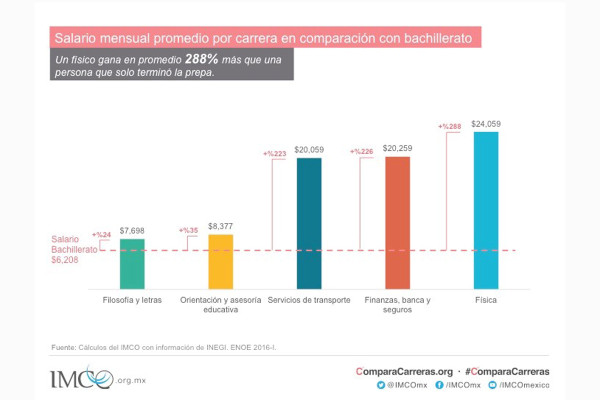 El IMCO presento este miércoles la herramienta Compra Carreras 2016 la cual pretende ayudar a los jóvenes en la toma de decisiones al momento de elegir en qué carrera universitaria invertir tomando en cuenta que el sueldo promedio de alguien que realizó estudios universitarios es 75 por ciento mayor que el de una persona que solo concluyó el nivel medio superior.