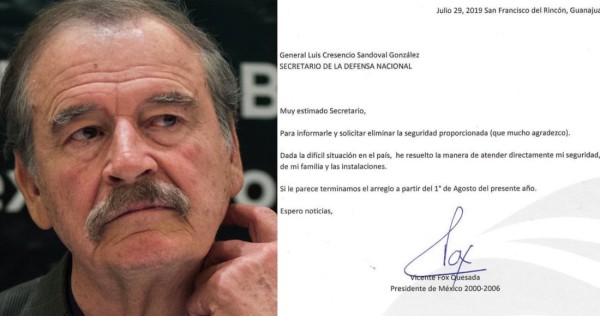 Ciudad de México (SinEmbargo).- El ex Presidente Vicente Fox Quesada renunció a la seguridad que le paga el Estado mexicano en una carta enviada al titular de la Secretaría de la Defensa Nacional, escueta, tan escueta que apenas agradece los servicios que se le prestaron, sin costo alguno, durante casi dos décadas.