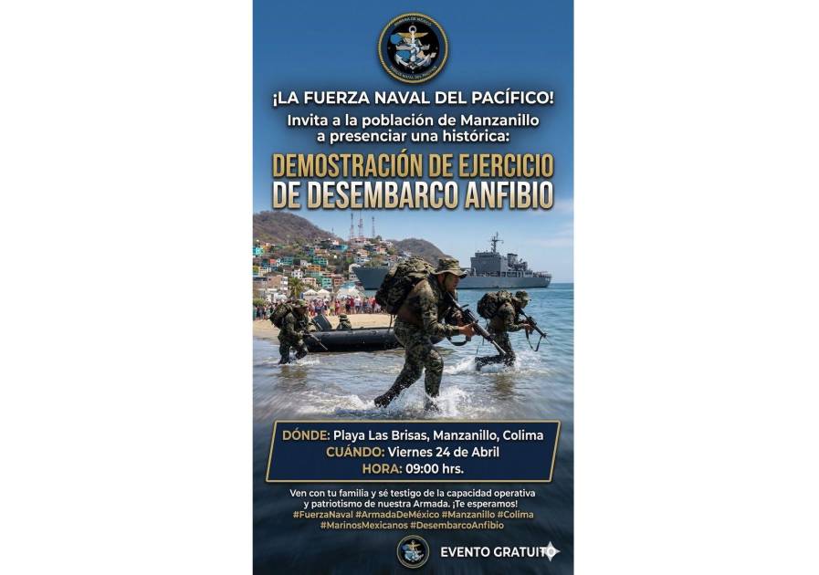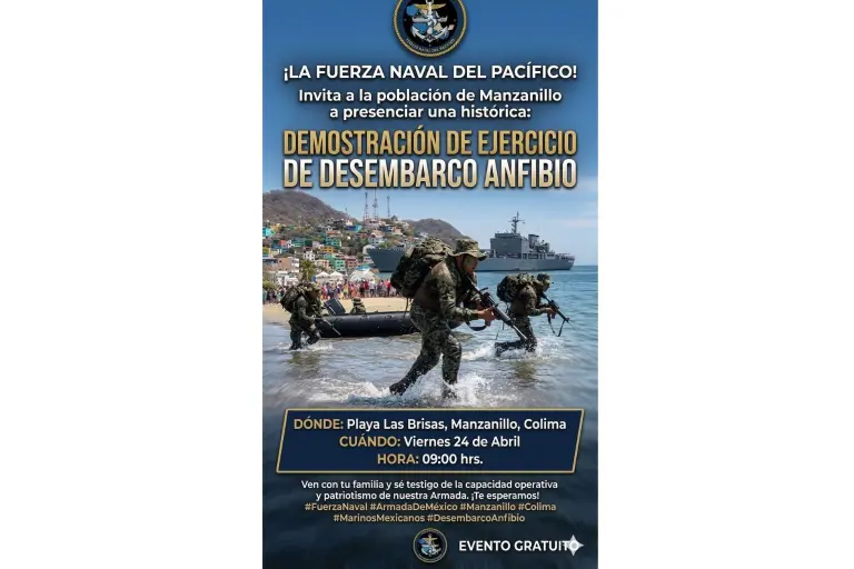 MANZANILLO, Colima._ La Secretaría de Marina-Armada de México, por conducto de la Fuerza Naval del Pacífico, invita a la población en general a presenciar un ejercicio demostrativo que realizará personal de la Infantería de Marina, adscrito al Batallón Anfibio de Infantería de Marina Número Dos, en playa “Las Brisas”, en Manzanillo.
