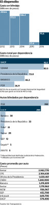 Las instituciones federales que más vehículos blindados poseen son la Procuraduría General de la República, con 357; la Secretaría de Hacienda y Crédito Público, con 295; el Banco de México, 38; la Presidencia de la República, 33; Tribunal Electoral del Poder Judicial de la Federación, 31; Secretaría de Marina, 28, y Secretaría de Educación Pública, con 12.