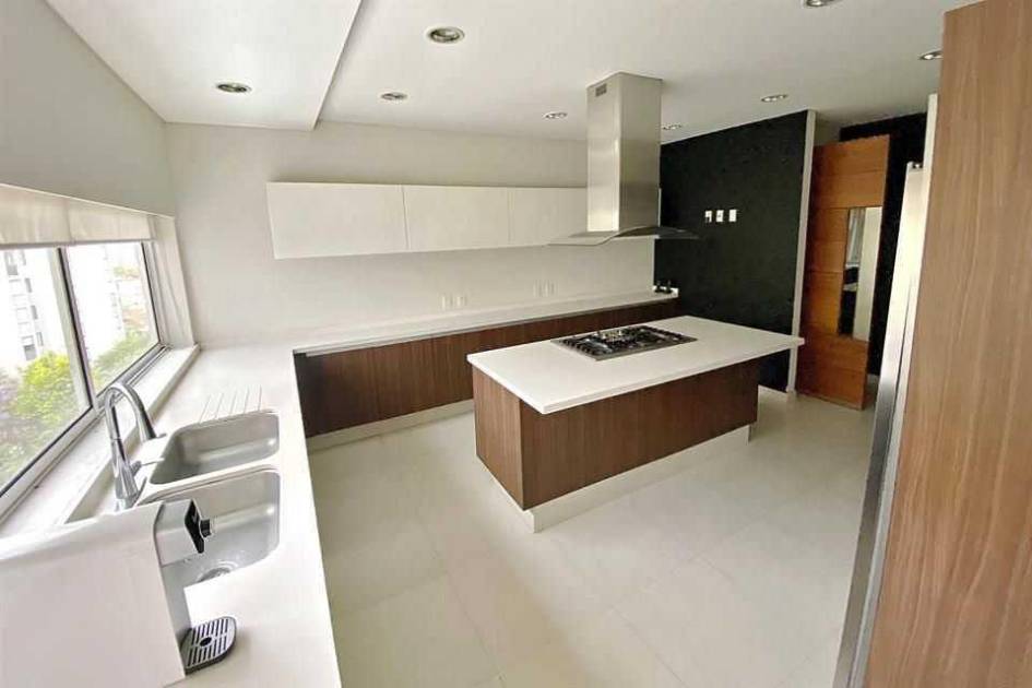 La recámara principal tiene un enorme vestidor con doble lavabo y espejos flotantes, dos baños, regadera y tina. Mientras que la cocina está equipada y cuenta con una isla central y acabados de madera, material que destaca también en pisos y muros del inmueble. El departamento cuenta, además, con cuatro cajones de estacionamiento y una bodega.