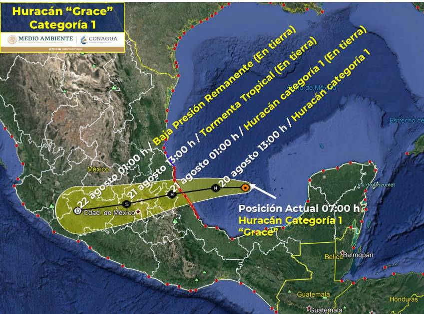En el transcurso del día, el huracán Grace se irá acercando a tierra y estaría impactando por la tarde-noche, entre Tecolutla y Nautla, al norte de Veracruz.