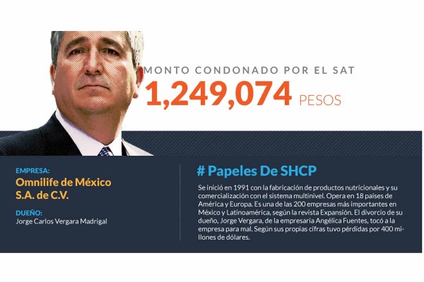 La historia de Omnilife es de éxito: fue fundada por Jorge Vergara Madrigal en 1991. En ese entonces, nadie creía en la idea de este empresario mexicano. Hoy, con 25 años en el mercado, es una de las 200 empresas más importantes en México y América Latina. Es otra de las empresas beneficiadas por el Sistema de Administración Tributaria en 2015 con la condonación de 1.2 millones de pesos de multa a los que la compañía se había hecho acreedora por no cumplir con el pago de sus impuestos. Pero en Jalisco, con las autoridades locales, otras empresas de Vergara Madrigal también han sido perdonadas de pagar créditos fiscales.