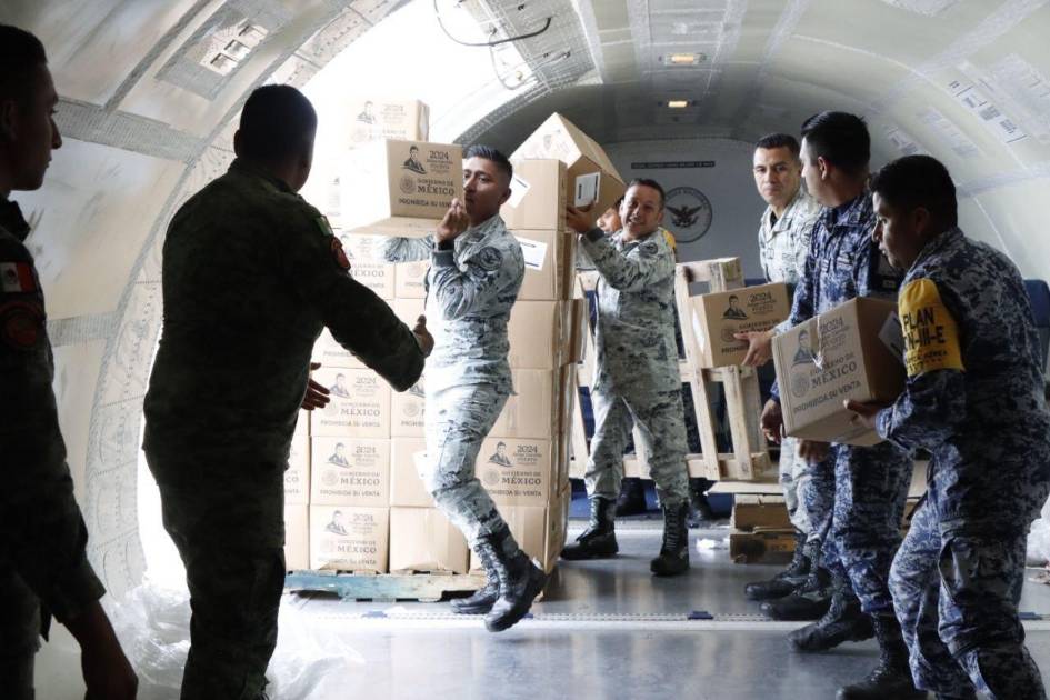 En la Base Aérea Militar Número 1 de Santa Lucía, en el municipio de Zumpango, Estado de México, la aeronave de la Guardia Nacional fue cargada con despensas, agua e insumos médicos.