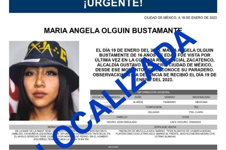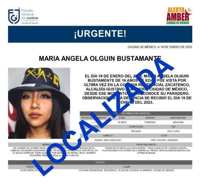 “Localizamos a la adolescente María Ángela, vista por última vez el 19 de enero en alcaldía Gustavo A. Madero. Agentes de la Policía de Investigación de la Fiscalía capitalina la trasladan a instalaciones de esta Fiscalía para ser reintegrada a su núcleo familiar. En breve mayor información”, informó la FGJ-CDMX.