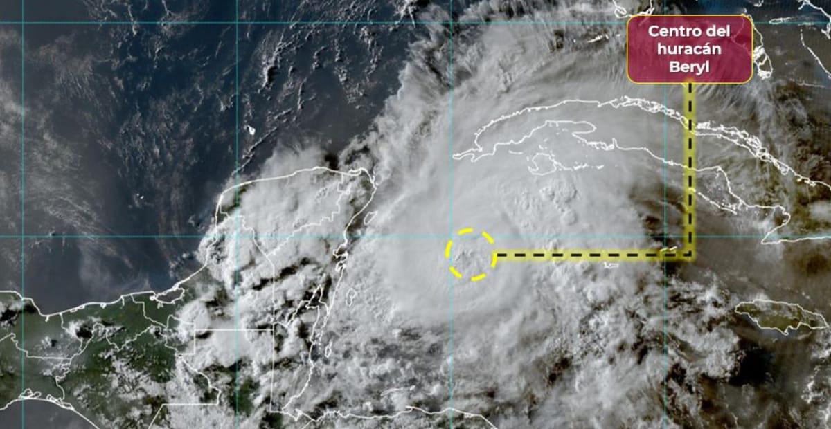 El huracán “Beryl” se intensificó este jueves de categoría 2 a 3 en la escala de Saffir-Simpson, alertó la Comisión Nacional del Agua, por lo que el fenómeno presenta vientos máximos sostenidos de 185 kilómetros por hora, con rachas de 230 kilómetros por hora, y se desplaza hacia la Península de Yucatán a 26 kilómetros por hora.