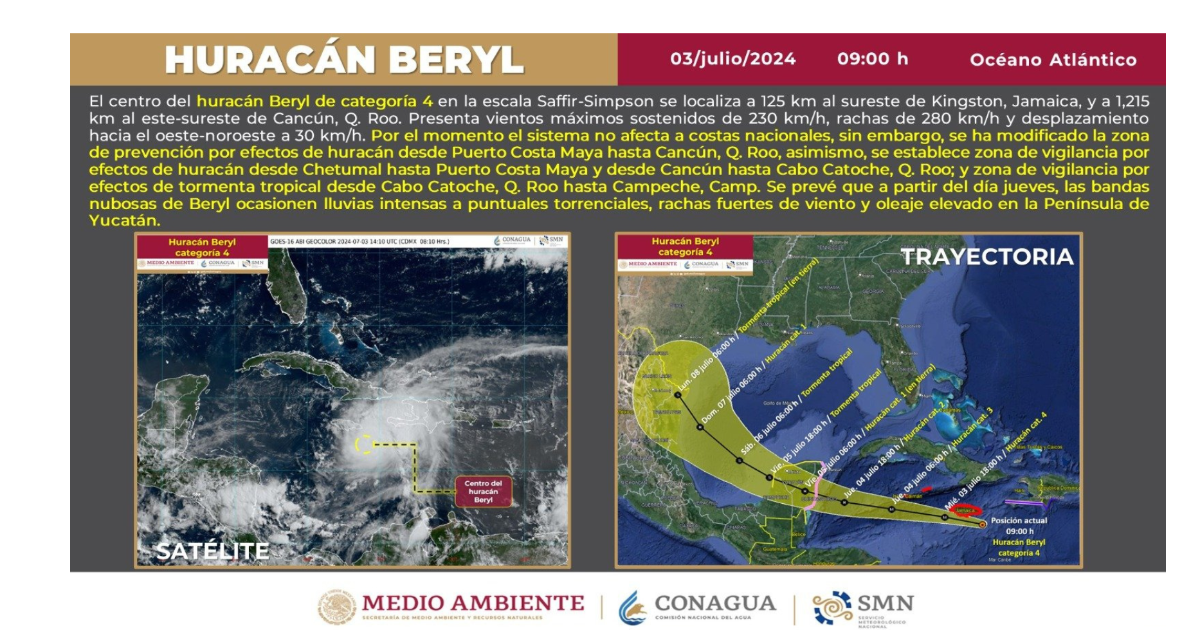 Este miércoles, el Huracán “Beryl” se localizaba en la región central del Mar Caribe, a 200 kilómetros (km) al sureste de Kingston, Jamaica, y a mil 300 kilómetros al este-sureste de Cancún, Quintana Roo.
