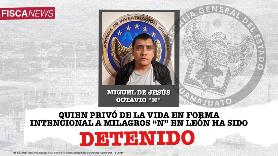 “Hemos logrado capturar en Noria Alta a Miguel, asesino de Milagros, perpetrado ayer (jueves) en León“, informó Alejandro Navarro, presidente municipal de Guanajuato.