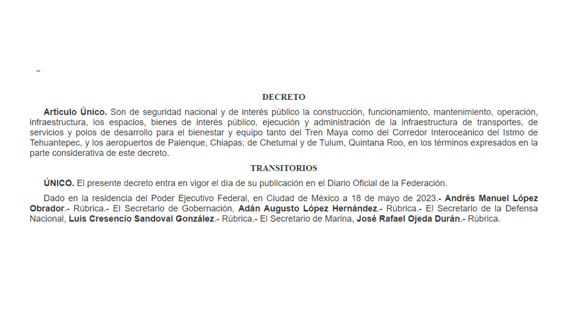 “Son de seguridad nacional y de interés público la construcción, funcionamiento, mantenimiento, operación, infraestructura, los espacios, bienes de interés público, ejecución y administración de la infraestructura de transportes, de servicios y polos de desarrollo para el bienestar y equipo tanto del Tren Maya como del Corredor Interoceánico del Istmo de Tehuantepec, y los aeropuertos de Palenque, Chiapas; de Chetumal y de Tulum, Quintana Roo, en los términos expresados en la parte considerativa de este decreto”, refiere el nuevo decreto, que incurre en una repetición del acto anulado en la primera controversia constitucional del INAI.