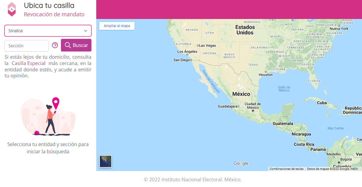 4. Oprimes el botón “buscar” y en la parte inferior te despliega un mapa con la ubicación de la casilla y un mapa en la parte derecha.