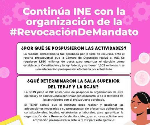“Sin embargo, aun con las adecuaciones presupuestales internas que ha llevado a cabo este Instituto, subsiste una insuficiencia presupuestal para organizar el proceso de revocación de mandato en los términos señalados por la Constitución y la Ley Federal de Revocación de Mandato”, agrega el INE.