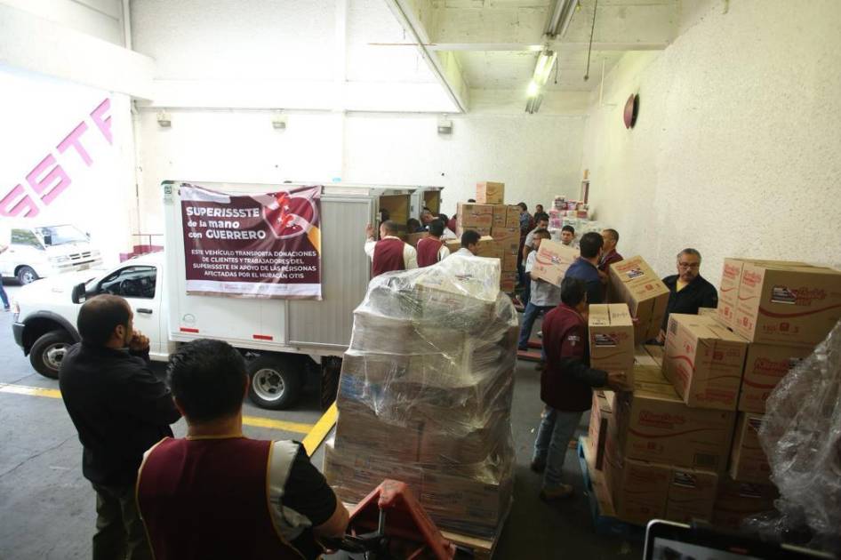 “Tenemos la instrucción de nuestro director general, de que todas las donaciones que llegan a los centros de acopio sean entregadas a las autoridades correspondientes para que sean repartidas a los damnificados en el puerto de Acapulco”, dijo Pavel Givert, frente al camión donde se cargaron paquetes con la etiqueta y leyenda “SuperIssste de la mano con Guerrero”, con donaciones de clientes y trabajadores del Superissste