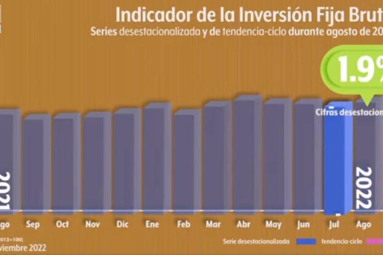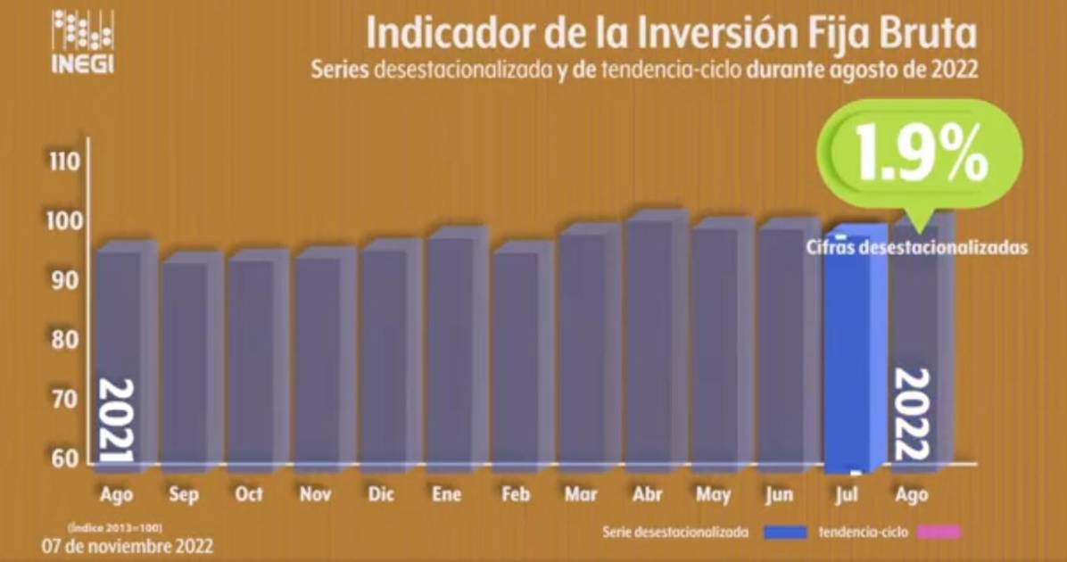 El Indicador Mensual de la Formación Bruta de Capital Fijo, detalló el Inegi, proporciona información sobre el comportamiento mensual de la inversión y se integra por los bienes utilizados en el proceso productivo durante más de un año; además, muestra una parte del valor agrado bruto que es invertido en la economía en lugar de ser consumido.