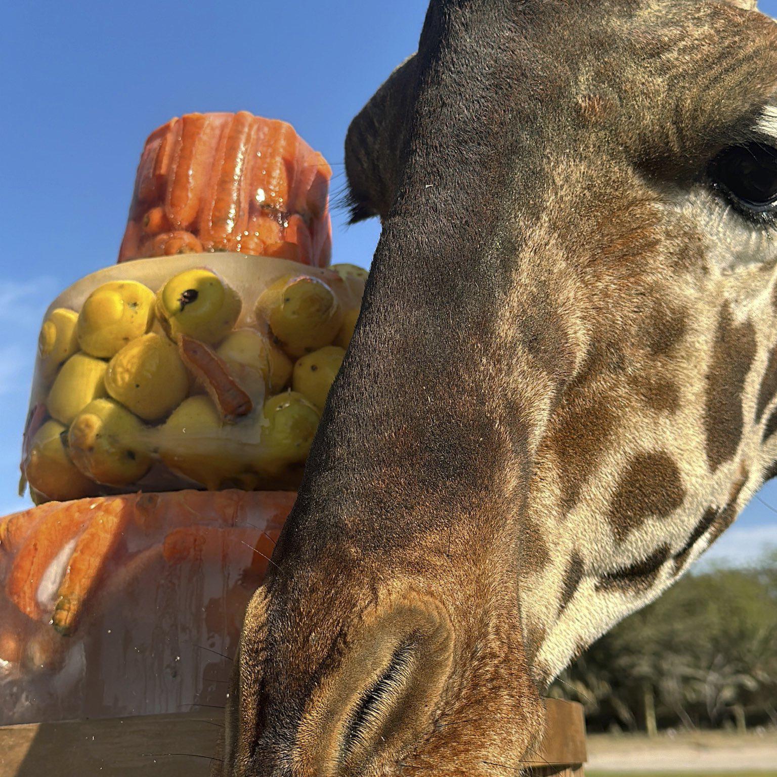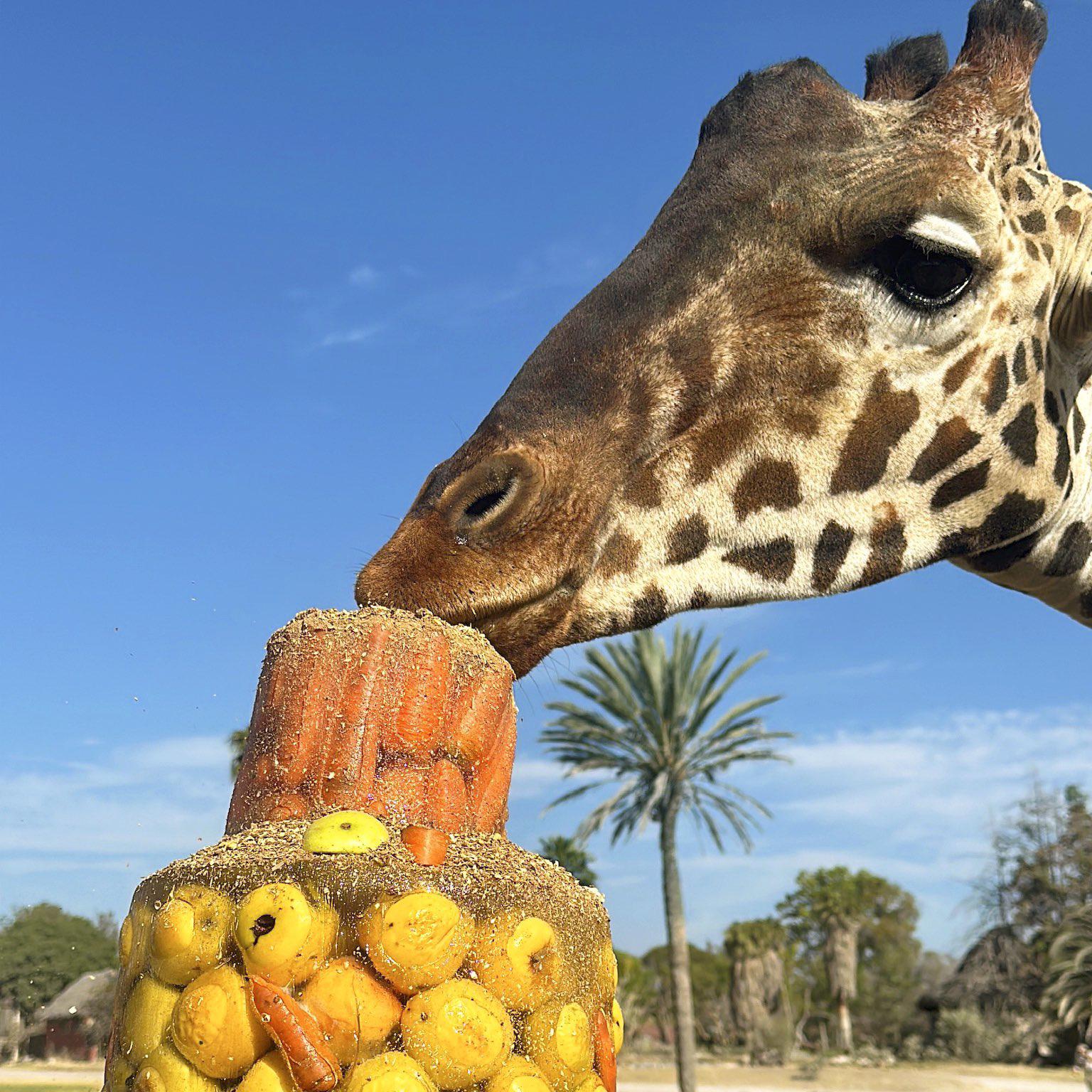 La integración se realizó durante la hora del desayuno de las jirafas, por lo que personal del parque preparó un pastel con alfalfa, zanahoria y manzanas para que pudieran compartir, de acuerdo con los expertos, Benito se integró sin ningún problema pues ni él ni el resto de la manada sintieron tensión.